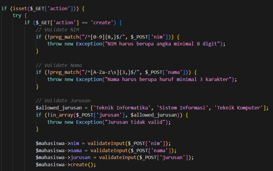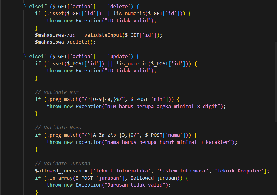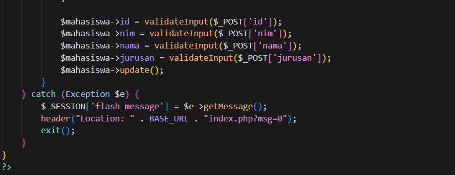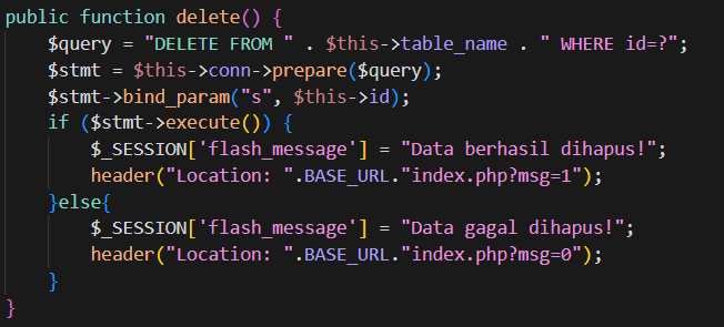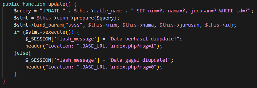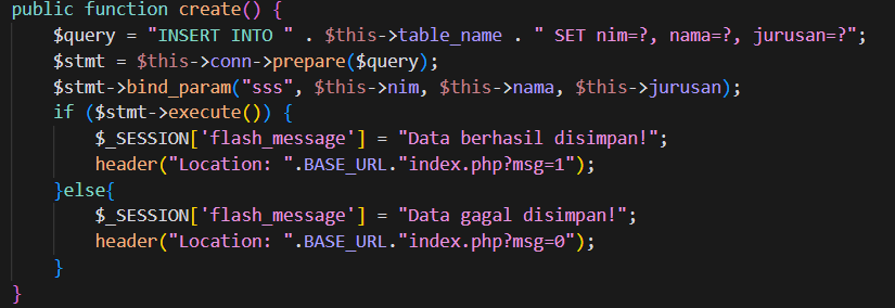 Prosesnya dimulai dengan menyiapkan query menggunakan metode prepare() dari objek koneksi $this->conn, lalu mengikat tiga parameter (nim, nama, jurusan) ke query menggunakan bind_param("sss", ...) dengan tiga s yang menunjukkan bahwa semua parameter bertipe string. Kemudian, jika eksekusi query berhasil, sebuah pesan sukses disimpan di $_SESSION['flash_message'] dan pengguna diarahkan ke index.php?msg=1. Jika gagal, pesan error disimpan dan diarahkan ke index.php?msg=0