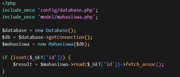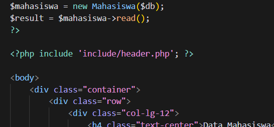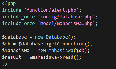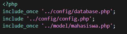 - Tambahkan file Database.php, Config.php dan model/Mahasiswa.php dengan menggunakan perintah include seperti gambar dibawah ini.