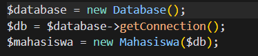 - Buat object baru Database dan mahasiswa kemudian koneksikan dengan database seperti kode program berikut.