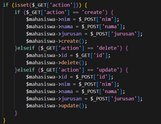 Pertama akan dilakukan pengecekan sebuah parameter action yang dikirimkan melalui method GET, jika ada terdapat parameter action yang dikirimkan maka nilai parameter akan diambil dan digunakan sesuai dengan fungsinya, ada 3 buah isi parameter yang dikirimkan yaitu create, delete dan update.
