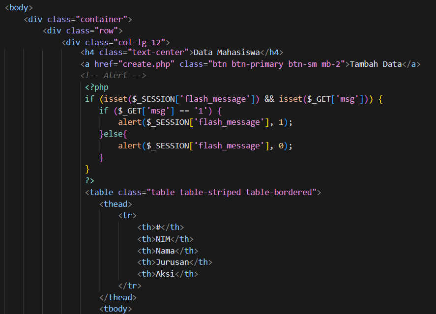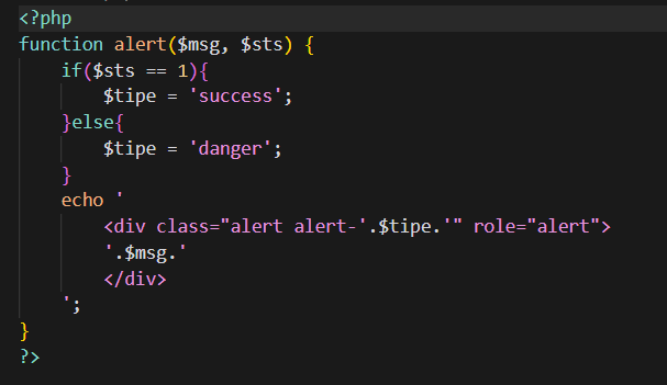 Kemudian, kita perlu membuat program alert.php. Alert.php digunakan untuk membuat sebuah function yang berfungsi untuk menampilkan pesan Ketika melakukan operasi terhadap data, fungsi ini memiliki 2 buah argument statement yaitu $msg yang berisi pesan dan $sts yang berisi kode jika status 1 maka pesan berhasil dan jika 0 maka pesan gagal. Berikut kode program fungsi alert.
