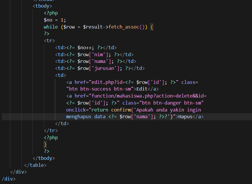 - buat fungsi delete untuk menghapus data mahaiswa berdasarkan ID, berikut ini kode program untuk fungsi delete.