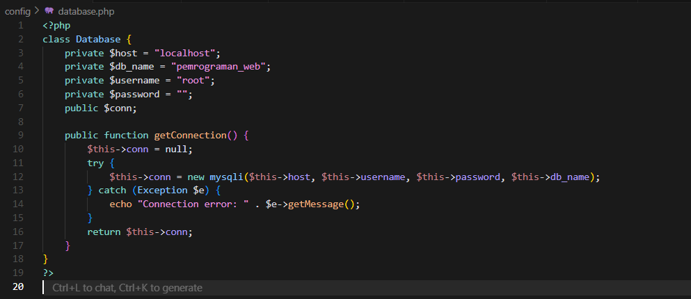 Potongan kode PHP tersebut mendefinisikan sebuah class bernama Database yang digunakan untuk mengelola koneksi ke database MySQL menggunakan ekstensi MySQLi. Class ini memiliki properti privat untuk menyimpan detail koneksi, yaitu host (localhost), db_name (nama database: pemrograman_web), username (root), dan password (kosong). Properti publik conn digunakan untuk menyimpan objek koneksi.
