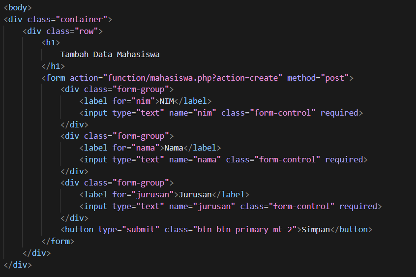 - buat fungsi create yang nantinya digunakan untuk menambahkan data mahasiswa seperti kode program berikut.