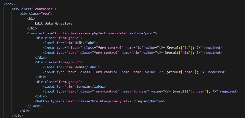 - buat fungsi update untuk melakukan perubahan data mahasiswa berdasarkan ID mahasiswa, berikut ini kode programnya.