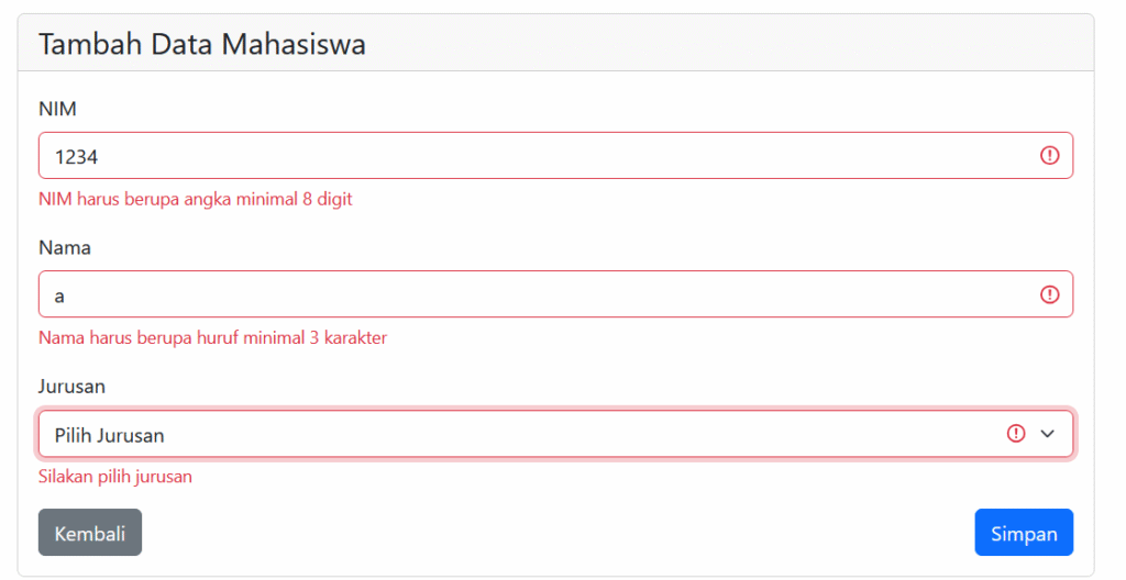 - Memberikan validasi jika input data salah