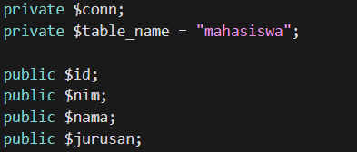 otongan kode PHP tersebut adalah bagian dari sebuah class (kemungkinan class Mahasiswa atau sejenisnya) dan berfungsi untuk menyimpan data baru ke dalam database. Fungsi create() ini menggunakan query SQL INSERT INTO untuk menambahkan data nim, nama, dan jurusan ke dalam tabel yang ditentukan oleh properti $this->table_name.
