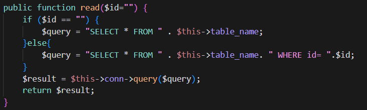 - buat fungsi read untuk menampilkan data mahasiswa, fungsi read memiliki default arameter $id yang berisi string kosong, jika $id == “” maka akan mengeksekusi query untuk menampilkan seluruh data mahasiswa, jika $id !== “” maka akan mengeksekusi query untuk menampilkan data mahasiswa berdasarkan id mahasiswa. Berikut kode program fungsi read.