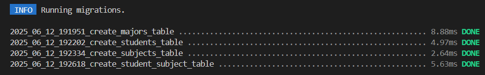 Setelah semua migrasi telah dibuat dan disave, jalankan migrasi database dengan perintah terminal: