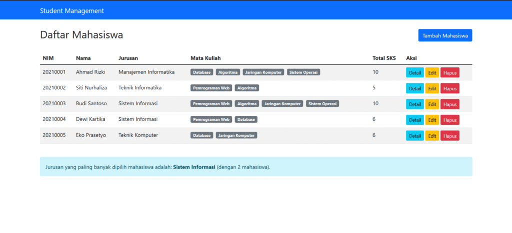 Jurusan yang paling banyak dipilih mahasiswa adalah: <strong>{{ $mostFrequentMajor->name }}</strong> (dengan {{ $mostFrequentMajor->students_count }} mahasiswa).
